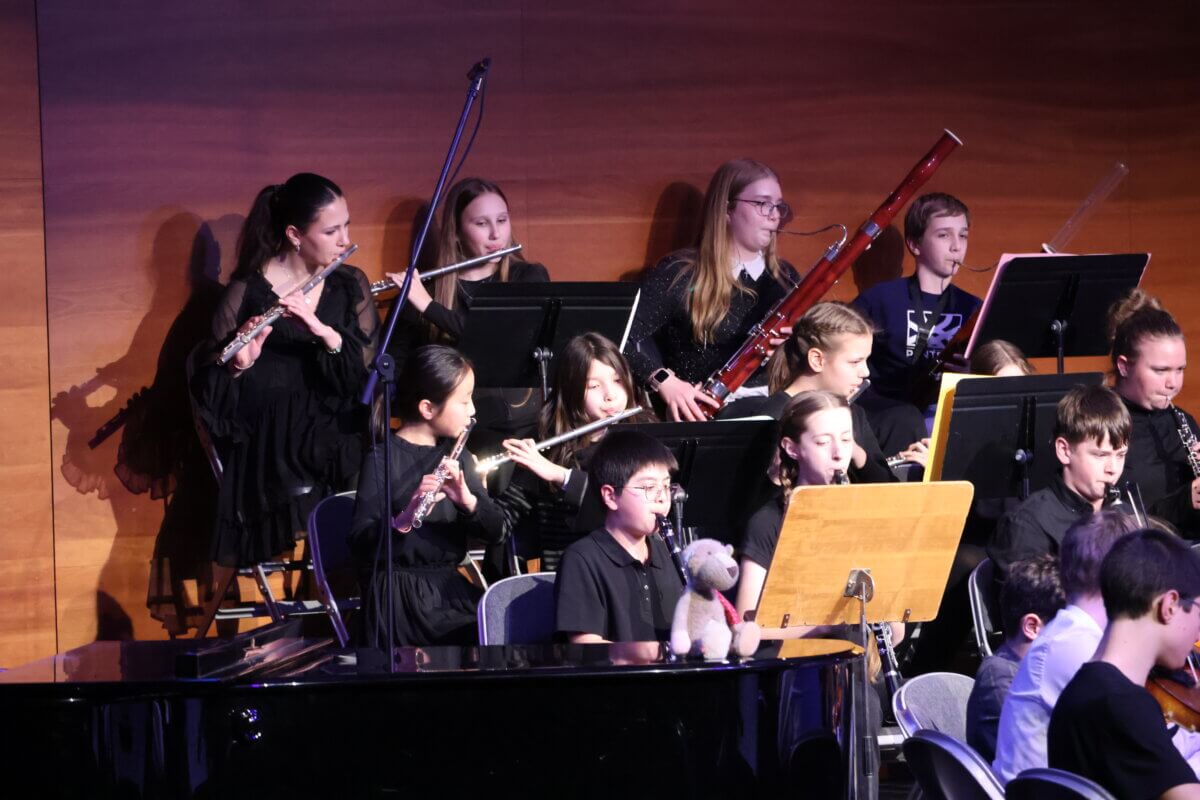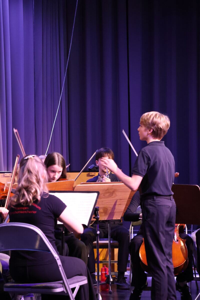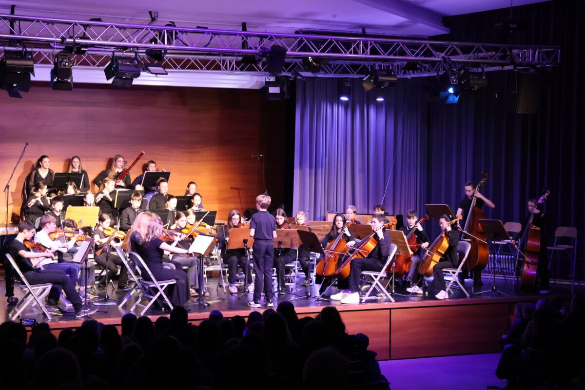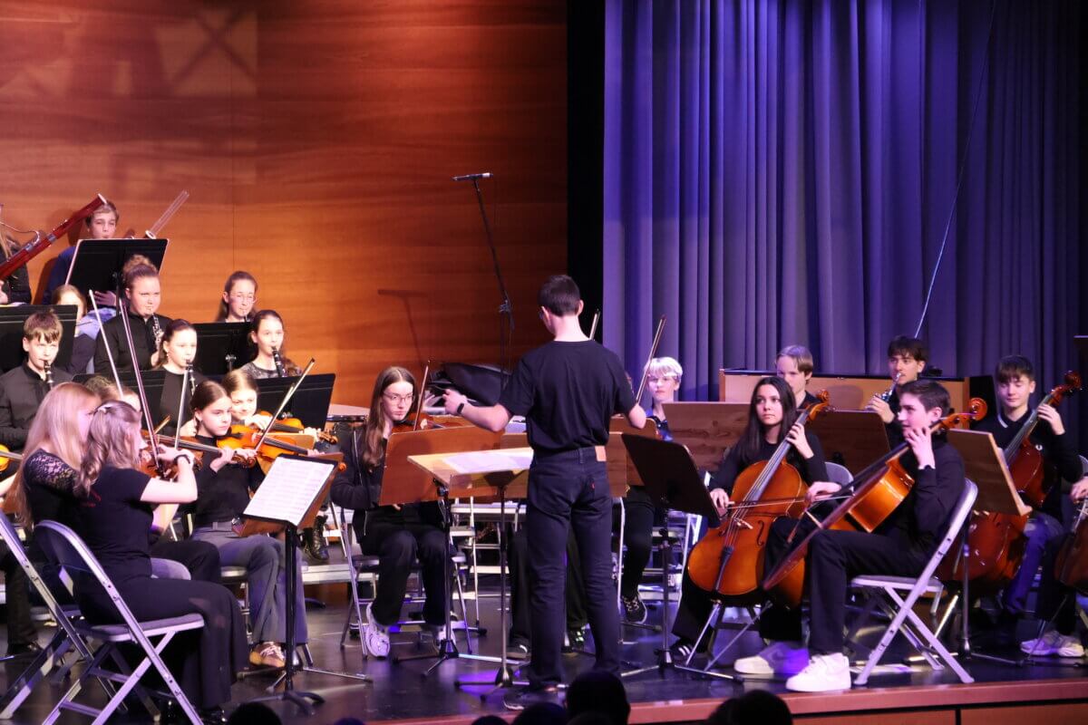 Anschließend betrat das Juniororchester, unter der Leitung von Alexander Burda, die Bühne und präsentierte mehrere abwechslungsreiche Stücke – von Debussy, dem Ungarischen Tanz von Brahms bis Pippi Langstrumpf. Besonders beeindruckend war dabei nicht nur das musikalische Können der jungen Instrumentalistinnen und Instrumentalisten, sondern auch der Mut und die Souveränität der Juniordirigentinnen und -dirigenten. Mehrere Schülerinnen und Schüler übernahmen selbstbewusst den Taktstock und führten das Orchester mit großer Konzentration und Ausdruckskraft. Hier zeigte sich deutlich, wie intensiv und erfolgreich während der Probentage im Haus Saron gearbeitet worden war.