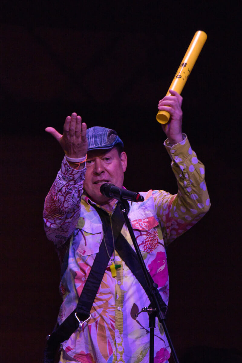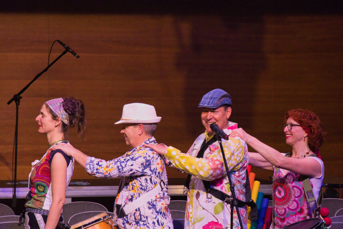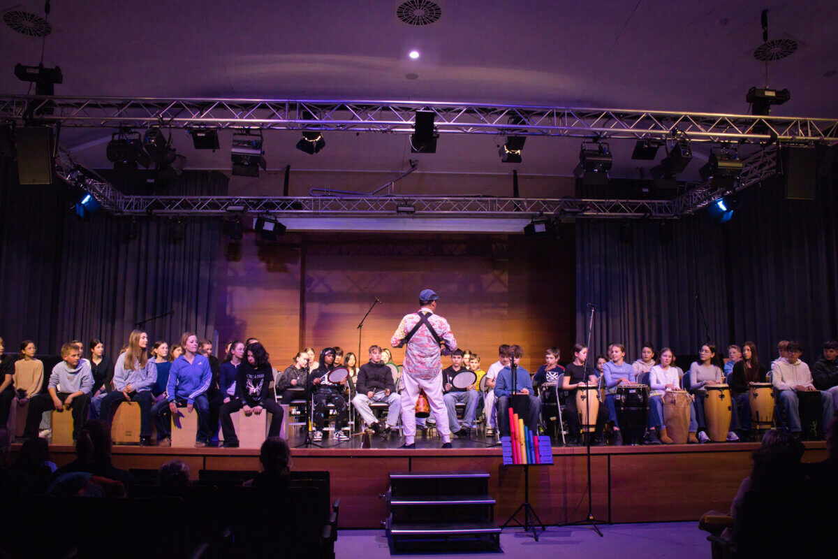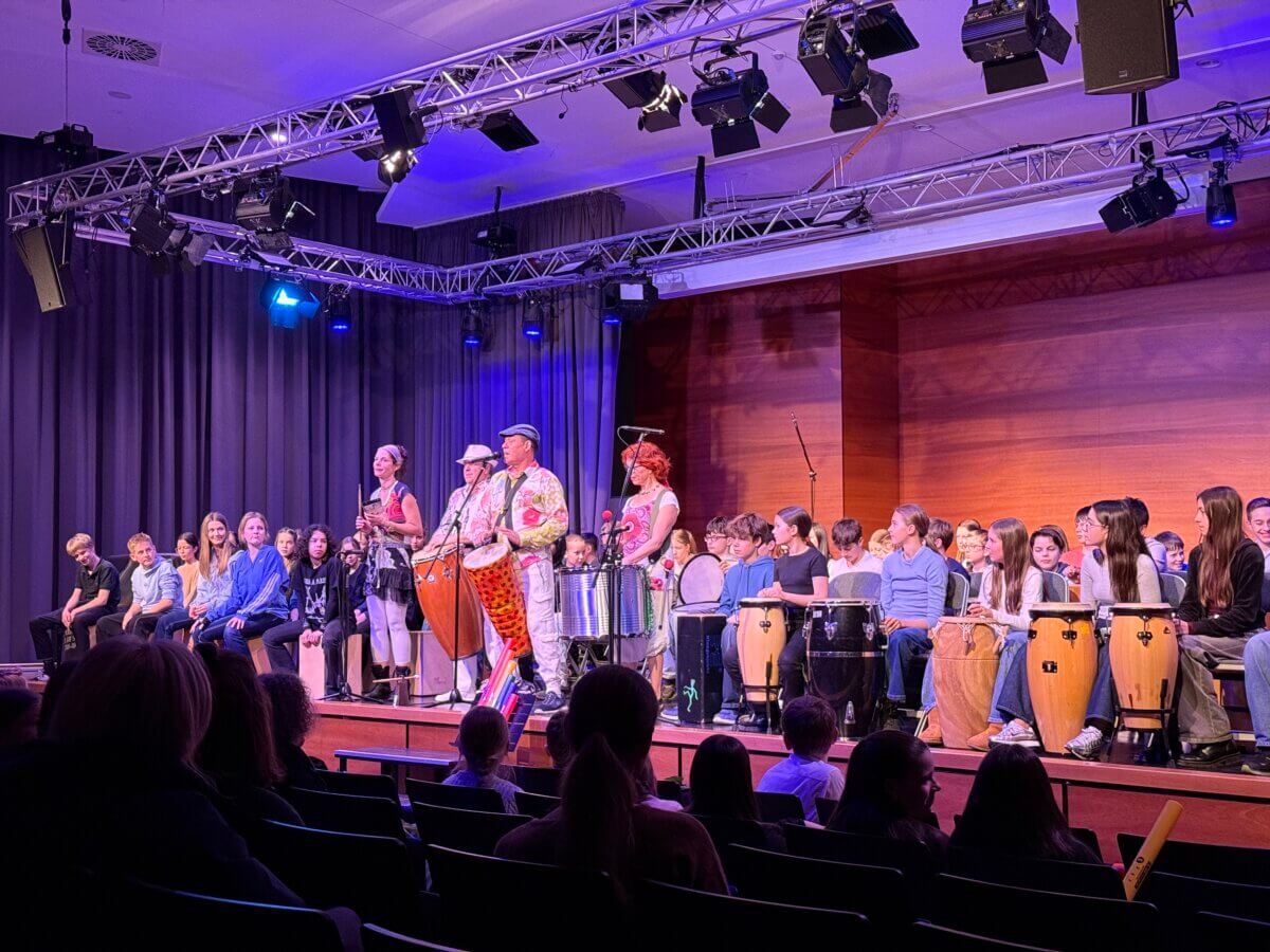 Das Rhythmusfieber packte nun wirklich alle: Niemand konnte mehr ruhig auf seinem Platz sitzen bleiben. Klatschen, Mitwippen, Mitstampfen – überall bewegten sich Hände und Füße im Takt. Als schließlich auch das Publikum aktiv eingebunden wurde, erreichte die Stimmung ihren Höhepunkt. Mit Klangröhren, die in der Aula verteilt waren, wurden die Zuhörerinnen und Zuhörer selbst Teil des musikalischen Geschehens. Gemeinsam entstanden vielschichtige Rhythmen, die eindrucksvoll zeigten: Rhythmus steckt in uns allen. Das Zusammenspiel aus Bühne und Publikum ließ die Grenzen zwischen Auftretenden und Zuhörenden verschwimmen und verwandelte die Aula in einen großen Klangraum voller Energie und Lebensfreude.