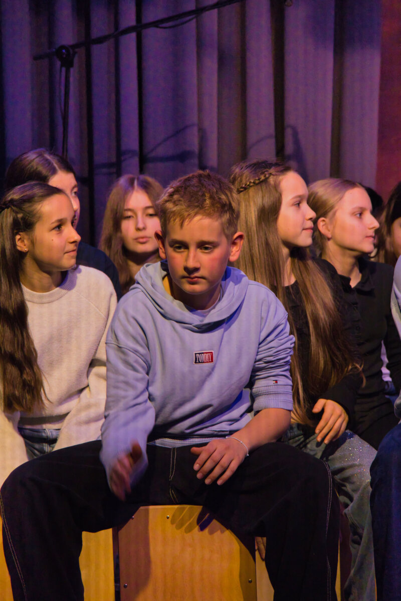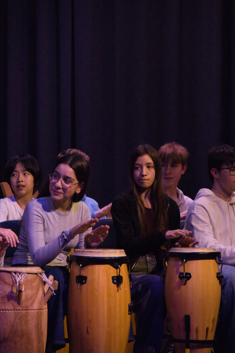 Die 7. Klassen brachten gemeinsam mit der Trommelgruppe um Till Ohlhausen die Aula endgültig zum Beben. Was zunächst mit einzelnen rhythmischen Motiven begann, entwickelte sich rasch zu einem pulsierenden Klangteppich, der den ganzen Raum erfüllte. Die Energie auf der Bühne übertrug sich unmittelbar auf das Publikum – eine mitreißende Gruppendynamik entstand, die in der gesamten Aula spürbar war.