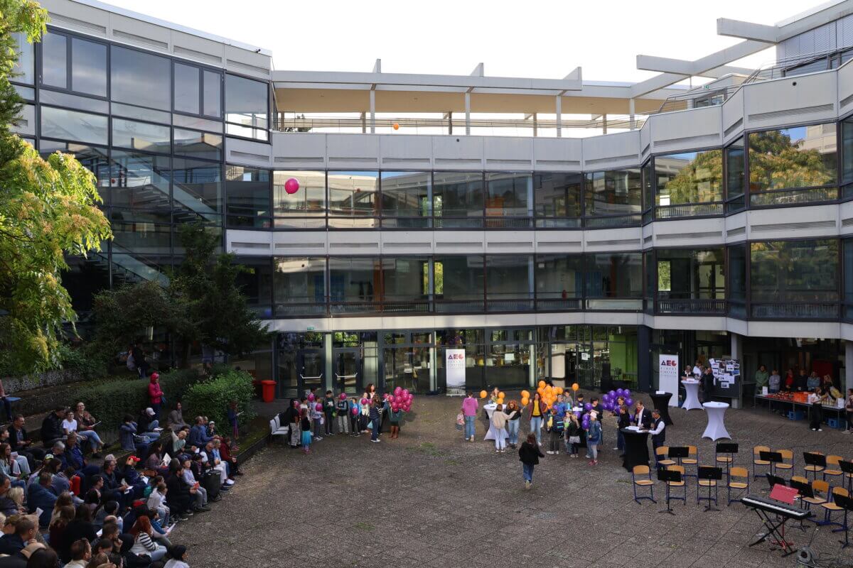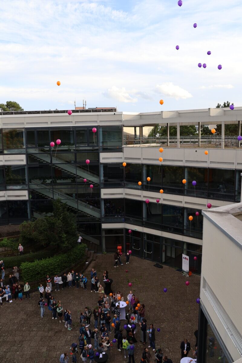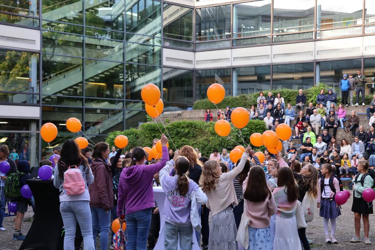 Zum Abschluss ließen die neuen Mitglieder unserer Schulgemeinschaft gemeinsam mit ihren Klassenlehrkräften bunte Luftballons in den AEG-Farben in den Böblinger Himmel steigen – ein schönes Symbol für den neuen Lebensabschnitt, der nun vor ihnen liegt.