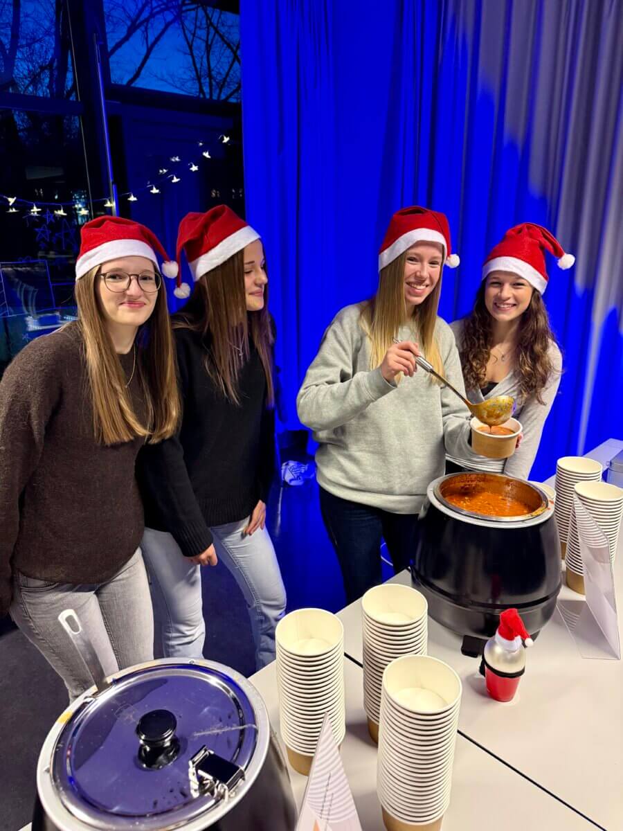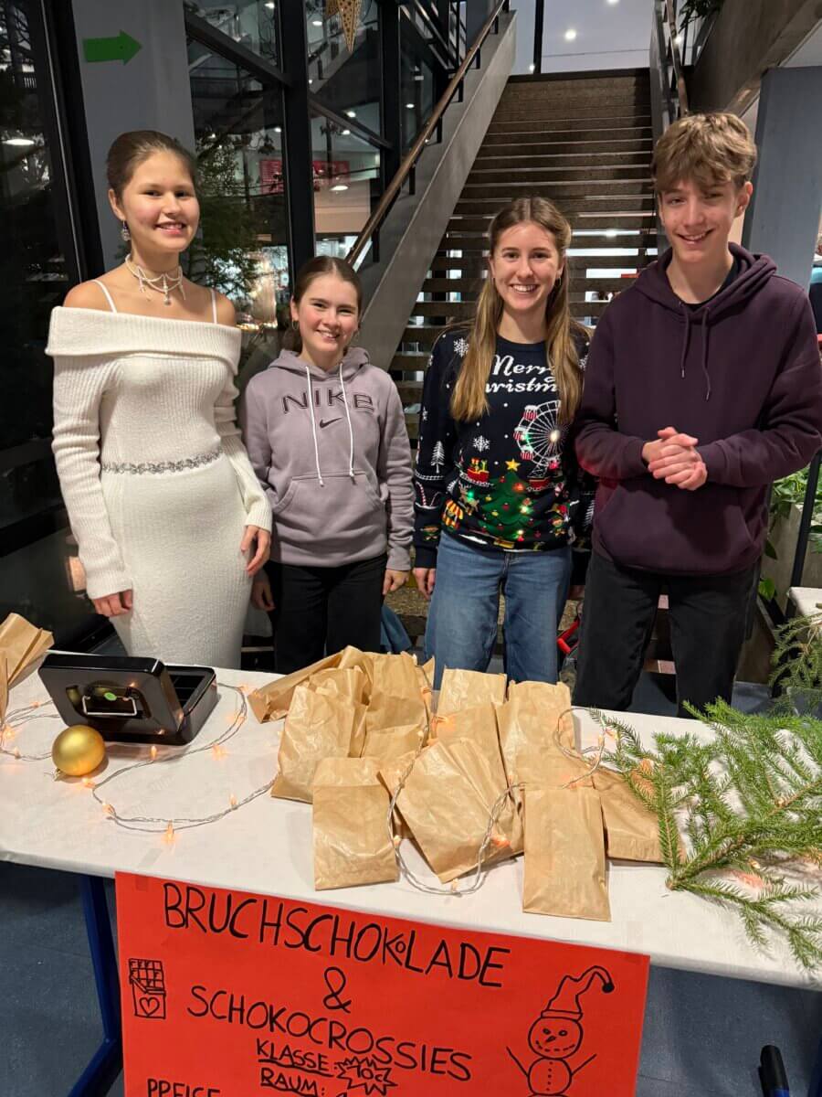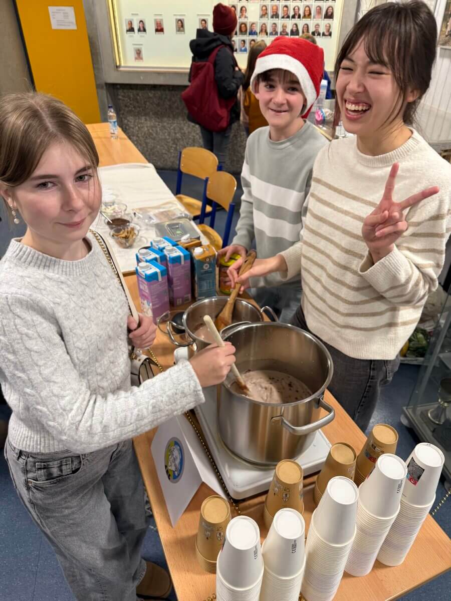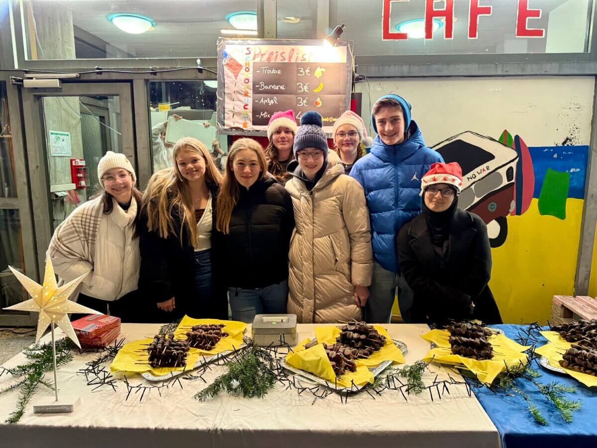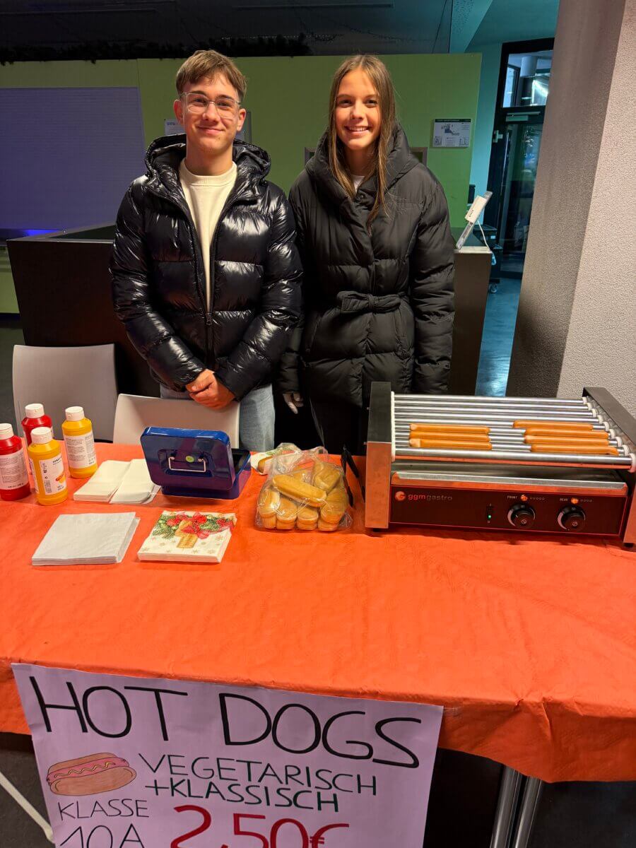 Zwischen funkelnden Lichtern und geschmückten Ständen präsentierten die Klassen ein breites Angebot an kulinarischen Köstlichkeiten. Von frisch zubereiteten Waffeln und Hotdogs bis hin zu aromatischem Chili – wahlweise con oder sin carne –, schokolierten Früchten, Punsch und Glühwein oder gebrannten Mandeln war für jeden Geschmack etwas dabei. Der verlockende Duft zog durch die Flure und lud zum gemütlichen Verweilen ein.